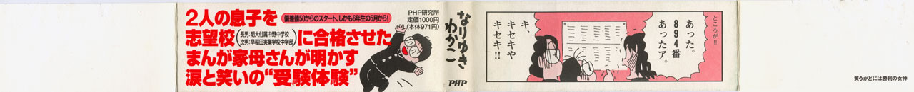なりゆき先生の二人の息子さんの私立中学受験記である「笑うかどには勝利の女神」のオビです。「流通量が少ないので、かなり貴重な本」であることはなり本コレクションのページにも書きましたが、それ以上にオビ付きのものは少ないような気がします(私の想像ですけど……)。